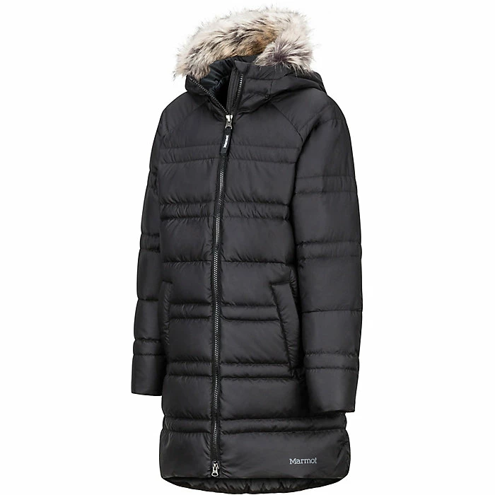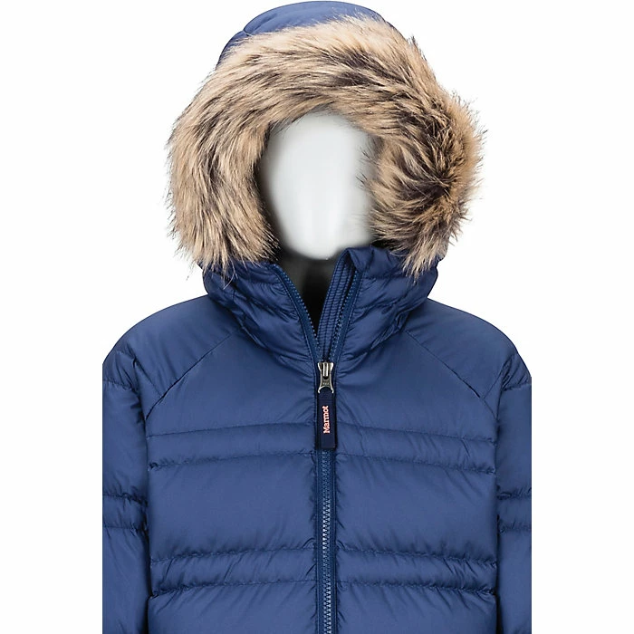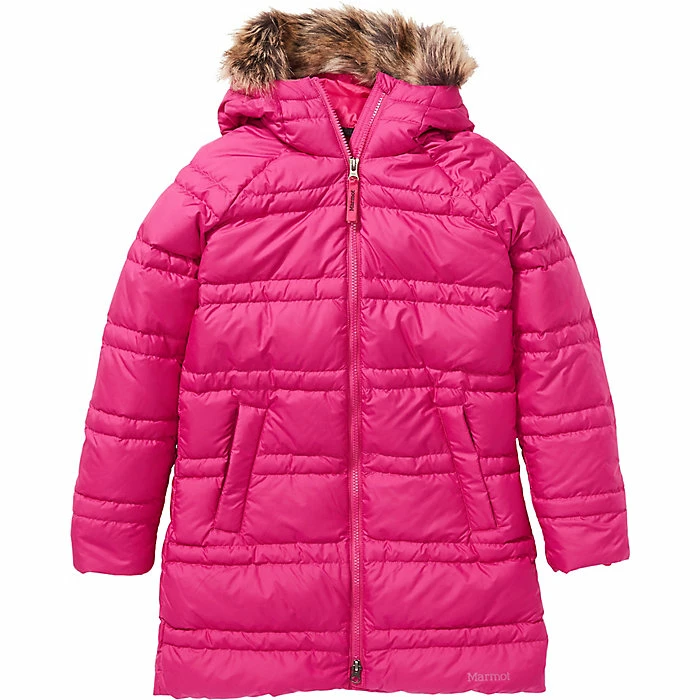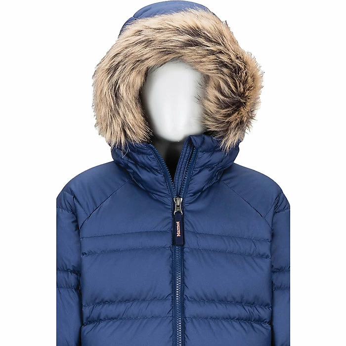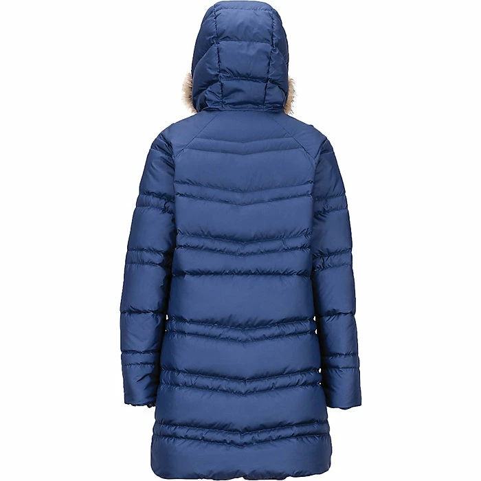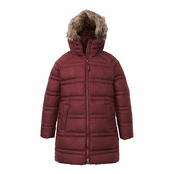 Beat the cold in style with the Marmot Girls’ Montreaux 2.0 Jacket. This long coat is packed with lofty 700-fill duck down all the way up through the hood to trap precious body heat. Both the down insulation and the exterior fabric feature a water-repellent treatment to ensure reliable warmth, even in wet conditions. With internal fleece storm cuffs and a comfy fleece lining around the collar and torso, this coat offers supreme coziness all winter long.