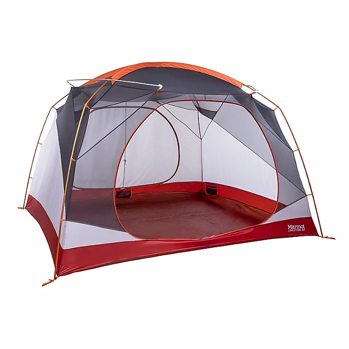 The Marmot Limestone 6P Tent is a family tent for bringing the whole brood along. Fitting up to 6 persons, this roomy palace is created with zone pre-vend construction, allowing for more vertical walls. This equals plenty of floor and head space. A big double door in the front opens up wide, while the D-shaped door at the back provides quick escape for a late-night call of nature. Pitches easily with color coded clips and poles and a rain fly shields the group from unsavory weather.