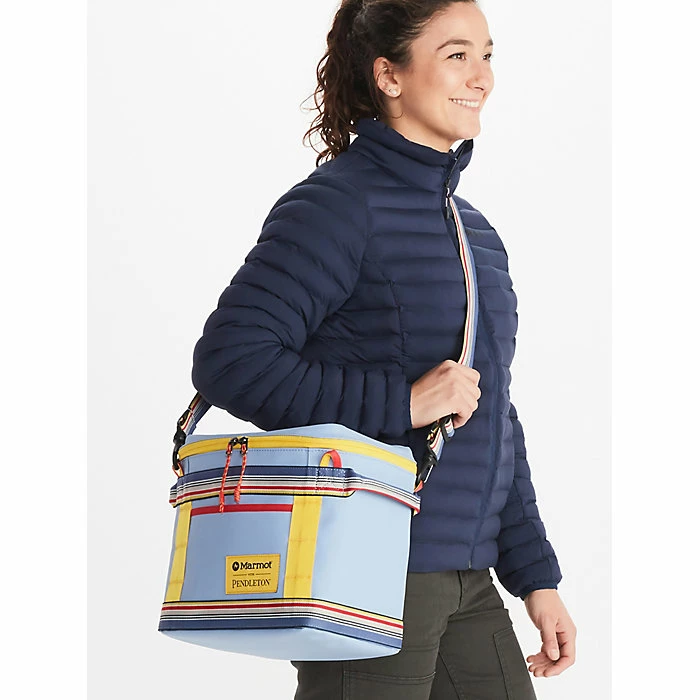 The Marmot Pendleton Soft Cooler Bag is a lightweight cooler for easy travel to the beach and on the trial. When the pathway is short but still requires a bit of walking, bring this with you for cold drinks out in nature. It carries comfortably on the shoulder with the padded strap. Marmot comes together with Pendleton for a eye-popping coloring in this EVA foam insulated cooler. The waterproof lining keeps everything wet on the inside, just open the zippered lid to grab a cold one.