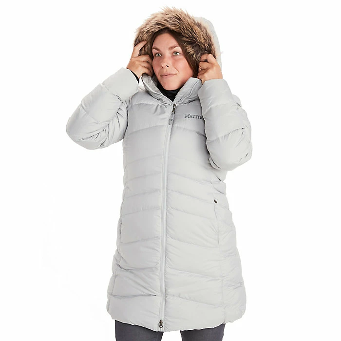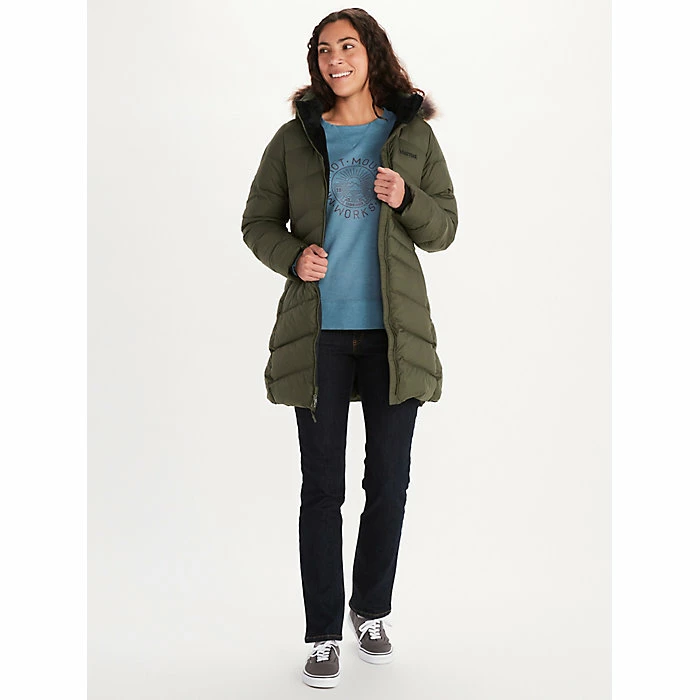 The Marmot Women’s Montreal Coat is a down coat for exploring winter cities. The Montreal uses 700 fill down that has been treated with Down Defender for moisture resistance. The high power down keeps the jacket lightweight, without sacrificing warmth. The interior is lined with fleece for cozy softness against the body with micro fleece internal cuffs to deter pesky drafts from being sent up your arms. Slip your hands into the lined side pockets for even more toasty micro fleece to turn up the heat. The outside pockets, as well as one of the interior pockets, zip shut to prevent wallet, keys, or your gloves from making a trip into a puddle of slush. Cover the tops of your legs (tush, butt, posterior, ect) with this mid-length coat for a winter without the chills.